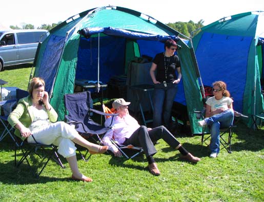 Exhibitors relaxing outside of their tent before they start showing