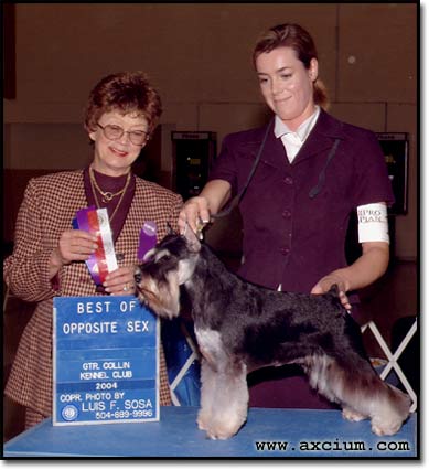 finished with 17 poins and a 4 point major i March -06. This is the most passionate dog I have ever met. A true Schnauzer, not easily bribed or bought, but once you've earned her love she will die for you.