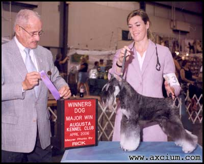 New Champion AND Grand Champion Axcium's StarStruck Striker finished on one coat with only majors, he won Reserve at the main show of the year Montgomery, and he beat the number one miniature schnauzer in the country twice - all before the age of 1!!! Striker has an outstanding headpiece, a striking outline, great reach and drive, wonderful size, tailset and bone. He is the first champion for his dam GCH Axcium's Star Witness. Co-owned with Robin Gatti Newbern.